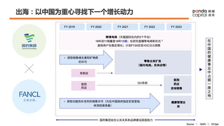 2016年至今:如前面所述,《功能性食品標示制度》出臺之后,對Fancl這樣的企業是非常大的利好。Fancl 抓住了政策紅利的機會,推出多款明星產品,實現銷售V字形反轉。截止到3月31日的2019財年,Fancl的營養補充劑銷售額達到439億日元(約合28億人民幣),毛利率接近70%。由于日本本土市場相對受限,Fancl也開始重點探求海外尤其中國的發展機會,尋求更大的發展空間。
