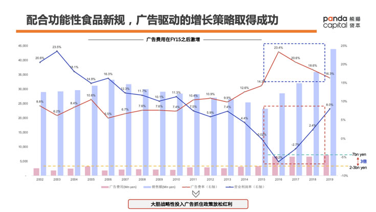 我們著重復盤一下在2015年《功能性食品標示制度》出臺之后,Fancl是如何利用政策紅利在廣告方面進行了戰略性投入從而大幅提升銷售額的。