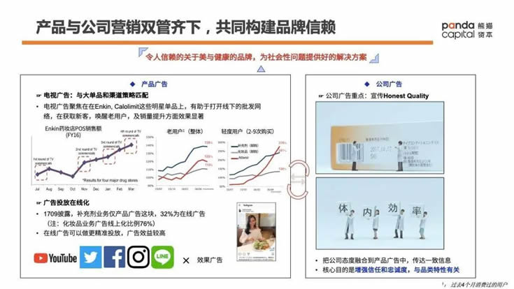對保健品這個品類而言,建立信任,增強忠誠度是品牌的難點和壁壘所在,因而相比其他品類,公司廣告的投入所打造出的靠譜的公司品牌形象也非常有必要。復盤來看,能夠在政策松動的流量紅利期大膽投入巨額廣告也是相當有效明智的決策,拉開了Fancl和其他競爭對手的身位,當然這也離不開Fancl之前在該領域持續的產品和渠道能力的積累。