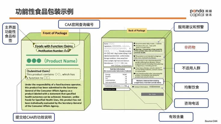 2015年新規出臺,全名為《功能性食品標示制度》。新規的很大不同在于政府不再實際評估功能性食品的安全和有效性,企業只需于上市銷售60日前向日本消費者廳提交與其聲稱的功能相符的科學依據進行備案,標識功能食品的流程被大大簡化。此外,2015年的新規新增了皮膚、眼睛、精神狀態、睡眠、疲勞等身體部位或者狀態,相比特定保健食品的認證品類(局限在脂肪酸,血糖等7大硬核領域)更為靈活,也更符合當代人更多元的健康訴求。