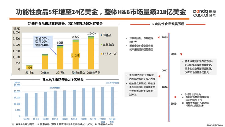 從更大的維度來看,日本健康(Healthy)和美容(Beauty)市場(簡稱H/B市場)整體是218億美金的規模。H/B食品分為兩類,一類為健康食品,比如在日常食品飲料中加入功能性的成分,占到60%左右;另一類是功能食品,比如維生素片等,占到40%左右。