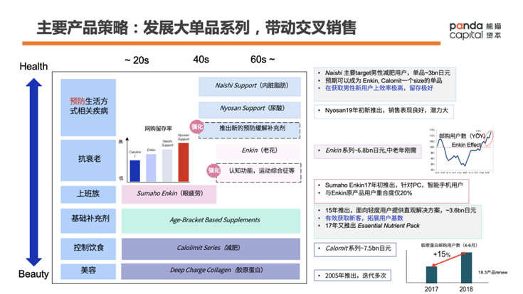 Enkin、Calolimit,以及現在女生們比較喜歡的膠原蛋白產品系列,這些都是Fancl的經典爆款產品系列。以著名的Enkin系列為例,最早針對老年人的老花癥狀推出,后來又逐步延伸到了針對年輕人的PC/手機眼疲勞現象,在眼健康這個垂直領域享有很高的市占率。值得一提的是,成功的大單品系列往往可以做到數十億日元的年銷售規模(比如Calolimit系列約為75億日元),回報豐厚。
