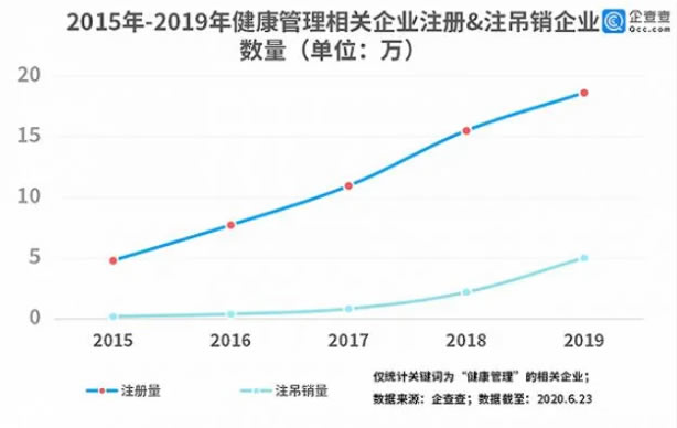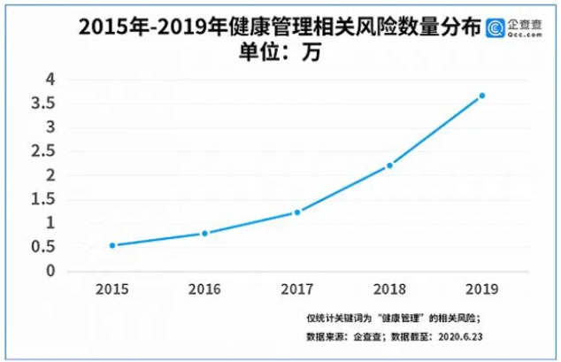 行業風險方面,企查查顯示,健康管理相關的風險數量在近年來直線上升,2015年,健康管理相關的風險數量為0.54萬條,而到了2019年,該數據已達到3.67萬。