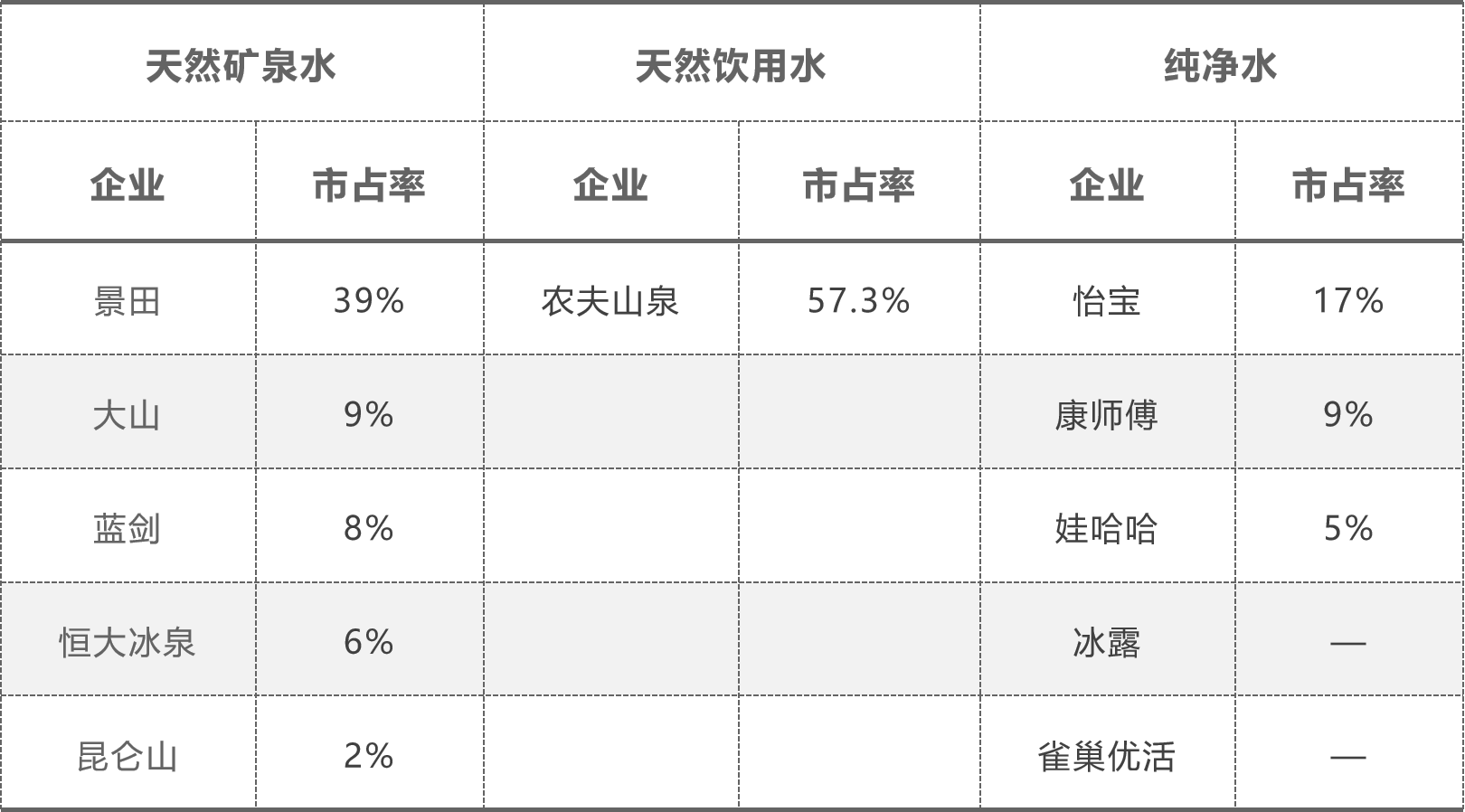 根據歐睿數據,2019年國內軟飲行業規模5786億元,其中瓶裝水為1999億元,占比為34.6%,穩居第一大品類,較2009年提升13.5%,且未來有望延續高增趨勢。其中天然礦泉水市場規模約為629億元,天然飲用水330億元,純凈水924億元,各品類龍頭企業及市占率如下: