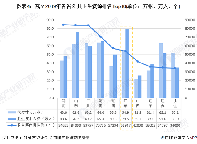 根據各地區發展統計公報,截至2019年,廣東省擁有床位數54.9萬張,在全國省份中排名第五位;擁有衛生技術人員79.5萬人,在全國省份中排名第一位;擁有衛生醫療機構53947個,在全國省份中排名第一位,排名第六位。