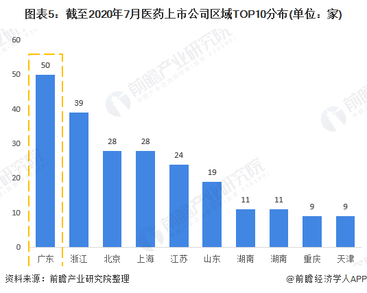 根據中信證券行業分類(2020)查詢,截至2020年7月27日,共有醫藥行業上市公司323家,其中廣東省領跑全國,有用50家醫藥業上市公司;其次是浙江省的39家;北京和上海不分上下,各擁有28家醫藥上市公司。