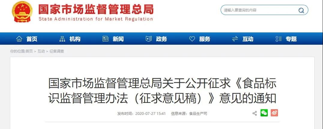 國(guó)家市場(chǎng)監(jiān)督管理總局關(guān)于公開征求《食品標(biāo)識(shí)監(jiān)督管理辦法(征求意見稿)》意見的通知