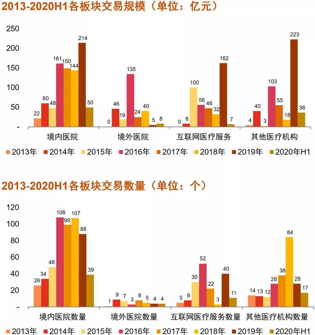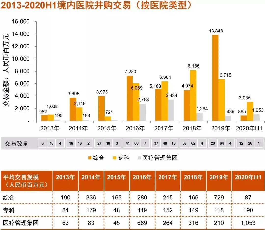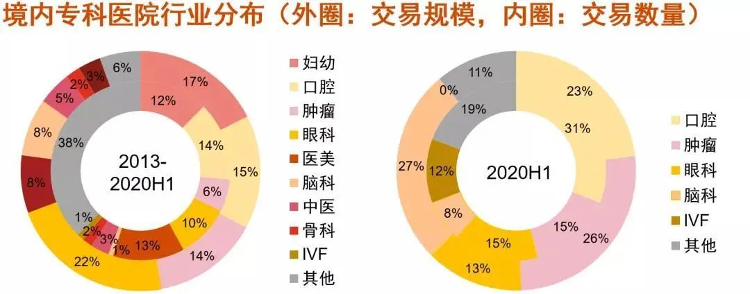 醫(yī)院板塊仍是最大熱點(diǎn)。相較于以往以企業(yè)醫(yī)院改制進(jìn)程為主的并購(gòu)趨勢(shì),以腦科、IVF、腫瘤為代表的專科醫(yī)院成為2020年上半年主要并購(gòu)趨勢(shì)。