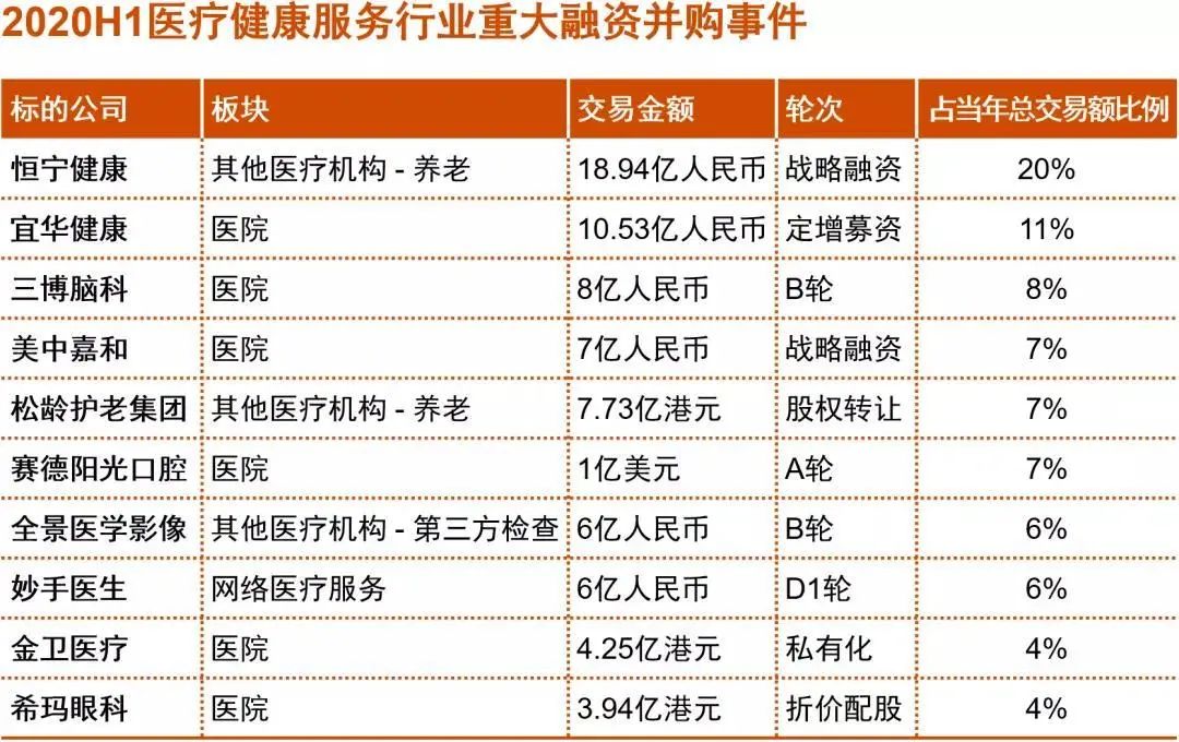 經(jīng)歷2019年體檢和互聯(lián)網(wǎng)醫(yī)療賽道的異軍突起,2020年上半年資本更加聚焦于傳統(tǒng)醫(yī)院板塊。在三博腦科、美中嘉和、賽德陽(yáng)光等融資并購(gòu)事件帶動(dòng)下,已披露的醫(yī)院并購(gòu)交易規(guī)模達(dá)49.5億人民幣,占據(jù)上半年醫(yī)療健康服務(wù)板塊投資規(guī)模的半壁江山。
