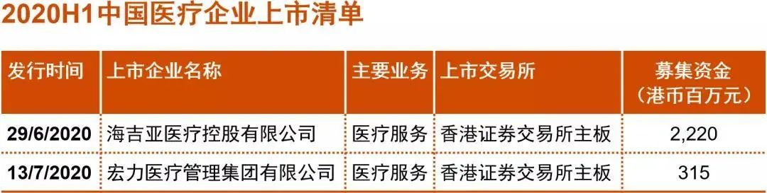 2020年上半年有兩家中國(guó)醫(yī)療服務(wù)提供商于香港證券交易所上市,海吉亞是國(guó)內(nèi)領(lǐng)先的民營(yíng)腫瘤醫(yī)療集團(tuán),經(jīng)營(yíng)或管理10家以腫瘤科為核心的醫(yī)院網(wǎng)絡(luò)。另一家上市的宏力醫(yī)療是河南領(lǐng)先的民營(yíng)綜合醫(yī)院。兩家上市企業(yè)均為縣域醫(yī)療等下沉市場(chǎng)孵化的民營(yíng)醫(yī)療集團(tuán)。在一、二線城市醫(yī)療競(jìng)爭(zhēng)環(huán)境逐漸激烈的情況下,民營(yíng)醫(yī)療資源在萬(wàn)億級(jí)下沉市場(chǎng)中的活力逐漸釋放,對(duì)公立醫(yī)療的補(bǔ)充作用愈加重要。在美股中概股回歸,A股市場(chǎng)降低紅籌企業(yè)回歸門檻的背景下,預(yù)計(jì)未來(lái)會(huì)有更多中國(guó)醫(yī)療企業(yè)于港股或A股上市。