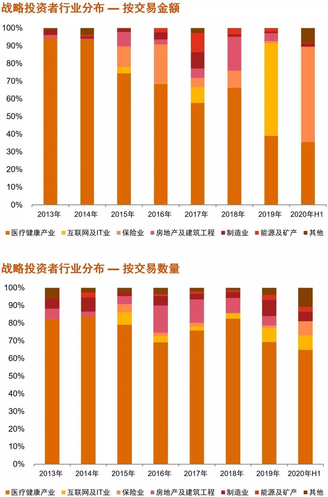 疫情助推下,醫(yī)療健康服務(wù)行業(yè)逆周期特點(diǎn)凸顯,更多的產(chǎn)業(yè)投資者希望借助跨界轉(zhuǎn)型尋求新的業(yè)務(wù)增長(zhǎng)點(diǎn)。非醫(yī)療健康產(chǎn)業(yè)的戰(zhàn)略投資人參與并購(gòu)活動(dòng)交易金額占比從2013年的6%提升至2020H1的64%,交易數(shù)量占比相應(yīng)從18%提升至35%。2020年上半年,在保險(xiǎn)業(yè)及其他產(chǎn)業(yè)投資者主導(dǎo)的并購(gòu)交易帶動(dòng)下,非醫(yī)療健康產(chǎn)業(yè)的戰(zhàn)略投資人在交易金額和交易數(shù)量占比在2019年基礎(chǔ)上進(jìn)一步提高4%。