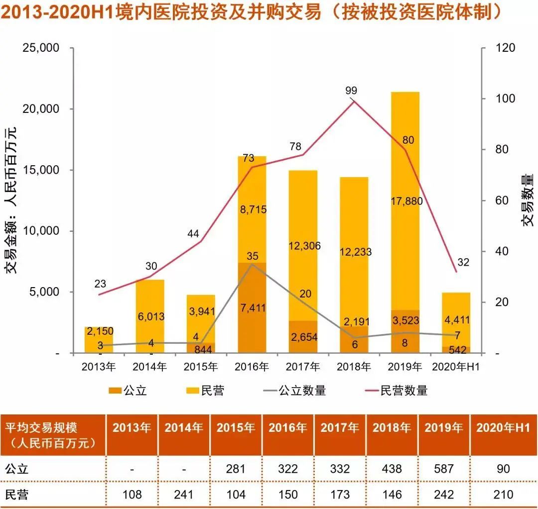 2020年上半年,社會(huì)資本投資境內(nèi)醫(yī)院依然處于調(diào)整期。公立醫(yī)院并購(gòu)交易熱度退燒,以國(guó)企醫(yī)院為代表的公立改制僅有制藥板塊上市公司通化金馬投資六家三、四線城市煤礦系綜合及專科醫(yī)院,平均交易規(guī)模相較以前年度顯著下滑。