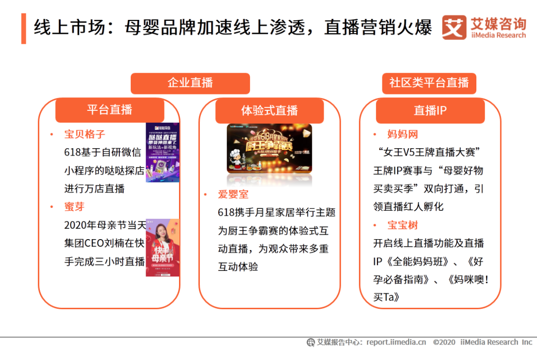 受疫情影響,線下母嬰門店經(jīng)營遇阻,各母嬰企業(yè)紛紛加速布局線上,采用線上直播的方式進(jìn)行品牌的營銷推廣。艾媒咨詢分析師認(rèn)為,消費(fèi)信息獲取渠道碎片化、多元化,被動(dòng)獲客的營銷方式難以抵抗激烈的競爭,線上直播的營銷模式有望常態(tài)化。