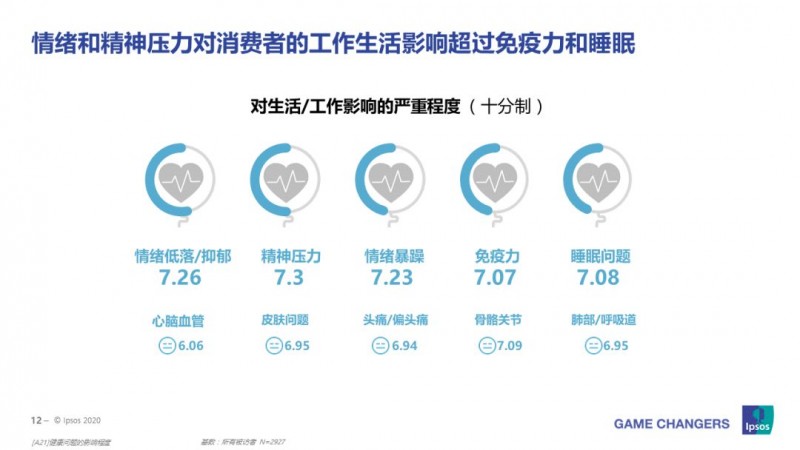 亞健康是指人體處于健康和疾病之間的一種狀態,處于亞健康狀態者,主要表現為一定時間內活力降低、功能和適應能力減退等癥狀。在接受調研的近3000名被訪者中,對精神壓力大、五官健康和頭皮頭發問題的關注度有所上升(對比2019年中國成人健康管理白皮書)。情緒低落(7.26)和精神壓力(7.3)對消費者的工作和生活的影響超過免疫力(7.07)和睡眠(7.09)問題。