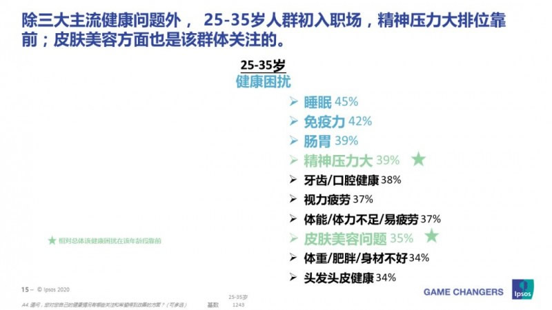 各年齡層對健康的關注點不同,年輕群體(18-24歲)在視力和口腔的健康關注較高,情緒和肥胖問題備受該群體關注。25-35歲的人,他們初入職場,容易出現焦慮,除了三大主流健康問題外,精神壓力大(39%)和皮膚美容(35%)也是該群體重點關注的方向。