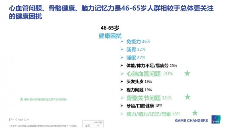 36-45歲的群體將健康的關注度放在腸胃(41%)、頭發健康(31%)和體重/肥胖(28%)等問題。隨著年齡的增長,心血管問題、骨骼健康、腦力記憶力是46-65歲人群相較于總體更關注的健康問題。