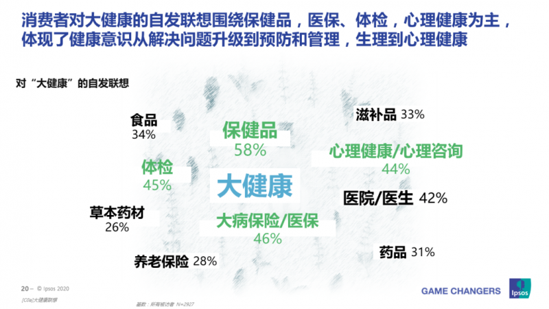 當問及消費者,什么是健康,消費者自發聯想到保健品(58%)、醫保(46%)、體檢(45%)和心理健康(44%)。這些體現了消費者健康意識從解決問題上升為主動管理,并且滲透到生活日常方面。消費者開始注重飲食調整,日常膳食搭配;運動健身,促進身體新陳代謝;調解生活方式,減少熬夜,放松心態,讓自己身心愉悅。