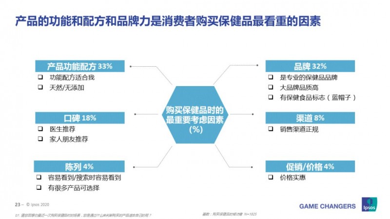 服用保健品(66%)也是消費者選擇改善自身健康狀況的方式之一。在購買保健品時,消費者會看中產品的功能配方(33%)和品牌力(32%)。現如今的消費者會以信任為前提去產生一個交易,醫生和家人朋友的推薦(18%)會影響消費者的購買決策。