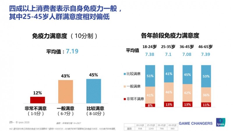 人們經常把免疫力低下與體弱多病聯系在一起。四成以上消費者表示自身免疫力一般,25-45歲人群對自己免疫力的滿意度偏低。消費者的免疫問題主要體現在體力/精力不足(47%)、天氣變化時容易感冒(35%)和身體恢復慢(30%)等癥狀。