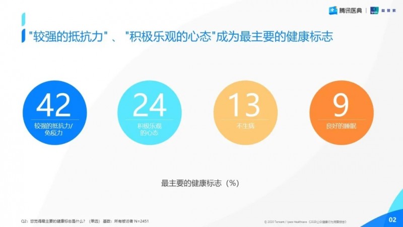 2020年初突如其來(lái)的新冠疫情,讓“健康”成為本年度最熱門(mén)的話題之一。隨著國(guó)內(nèi)疫情得到逐步控制,公眾的健康觀念,態(tài)度和方式已然發(fā)生了改變。益普索Ipsos研究發(fā)現(xiàn)在疫情的影響下公眾健康防范意識(shí)得到了極大的提升。提到健康,傳統(tǒng)的觀念就是“不生病”,而在此次調(diào)研中,多達(dá)42%的公眾將“較強(qiáng)的抵抗力/免疫力”視為最主要的健康標(biāo)志。此外,突發(fā)的疫情對(duì)公眾的心理產(chǎn)生了一定的沖擊,心理健康這一話題被再次關(guān)注,“積極樂(lè)觀的心態(tài)”也成為新的健康標(biāo)簽。