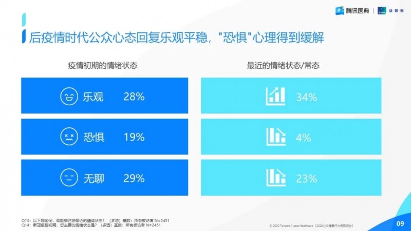 疫情初期,多數(shù)人隔著屏幕,不斷地刷新疫情信息,特別是每天一早起來(lái)的疫情數(shù)據(jù)變化,不知不覺(jué)中對(duì)公眾的生理、心理和行為產(chǎn)生了影響。高達(dá)19%的公眾表示自己在疫情初期存在恐懼情緒。而隨著國(guó)內(nèi)疫情得到控制,后疫情時(shí)代公眾心態(tài)已回復(fù)樂(lè)觀平穩(wěn),恐懼心理下降到4%,得到了極大的緩解。