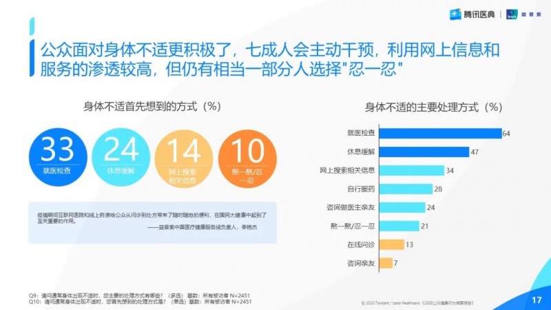 在心態(tài)回復(fù)平靜,日常生活趨于正常化后,公眾在應(yīng)對(duì)身體不適上更積極了。盡管仍有部分公眾選擇“忍一忍”(21%),但有近七成的受訪者表示“就醫(yī)檢查”是自己應(yīng)對(duì)身體不適的主要方式。與此同時(shí),益普索中國(guó)醫(yī)療健康服務(wù)線負(fù)責(zé)人李艷杰認(rèn)為,疫情期間互聯(lián)網(wǎng)醫(yī)院和線上藥房給公眾從問(wèn)診到處方帶來(lái)了隨時(shí)隨地的便利,在國(guó)民大健康中起到了至關(guān)重要的作用。