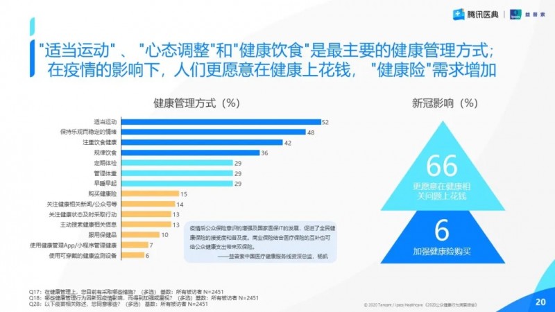 除了更積極地應(yīng)對(duì)已發(fā)生的健康問(wèn)題外,疫情也讓公眾更加意識(shí)到保持健康的重要性,"防范于未然"的意識(shí)得到了全面的提升。后疫情時(shí)代的公眾健康管理方式呈現(xiàn)出從“被動(dòng)治療”到“主動(dòng)預(yù)防”,“生理健康”和“心理健康”兩手抓的趨勢(shì)。在疫情的影響下,有66%的公眾表示更愿意在健康上花錢(qián)了,疫情激發(fā)了公眾對(duì)“健康險(xiǎn)”的需求。益普索中國(guó)醫(yī)療健康服務(wù)線資深總監(jiān)楊凱認(rèn)為,疫情后公眾保險(xiǎn)意識(shí)的增強(qiáng)及國(guó)家醫(yī)保IT的發(fā)展,促進(jìn)了全民健康保險(xiǎn)的接受度和普及度。商業(yè)保險(xiǎn)結(jié)合醫(yī)療保險(xiǎn)的互補(bǔ)也可給公眾健康支出帶來(lái)雙保險(xiǎn)。