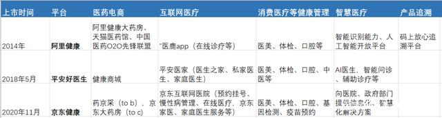 除了阿里健康有產品追溯而京東健康、平安好醫生沒有以外,三者都有醫藥電商、互聯網醫療、消費醫療、智慧醫療等業務。