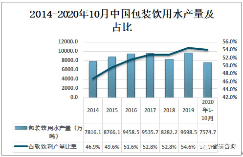 中國包裝飲用水產業(yè)始于20世紀90年代中期,隨著近年來環(huán)境污染加劇,人們對飲用水的安全要求不斷提高,包裝飲用水產業(yè)取得飛速發(fā)展。2019年中國包裝飲用水產量為9698.5萬噸,占中國軟飲料產量的54.6%;2020年1-10月中國包裝飲用水產量為7574.7萬噸,占中國軟飲料產量的54.1%。