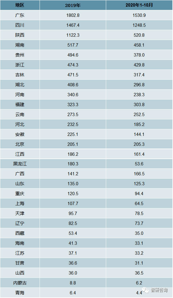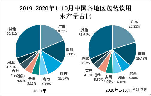 2019年廣東包裝飲用水產量占比為18.59%,四川包裝飲用水產量占比為15.13%,陜西包裝飲用水產量占比為11.57%;2020年1-10月廣東包裝飲用水產量占比為20.21%,四川包裝飲用水產量占比為16.48%,陜西包裝飲用水產量占比為6.88%。