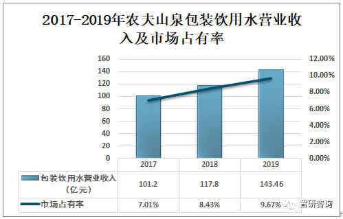 2018年農夫山泉包裝飲用水營業(yè)收入為117.8億元,市場占有率為8.43%;2019年農夫山泉包裝飲用水營業(yè)收入為143.46億元,市場占有率為9.67%。