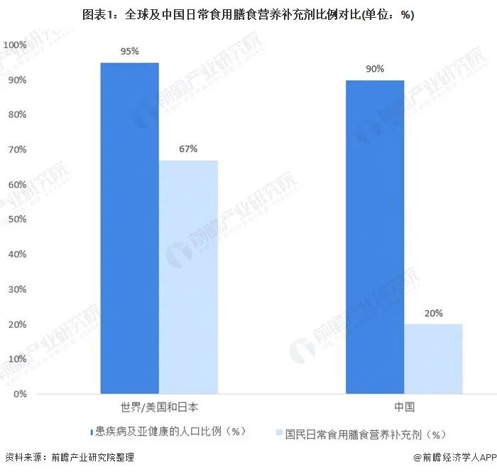 膳食營(yíng)養(yǎng)補(bǔ)充劑面向的消費(fèi)者大多是存在健康問(wèn)題的亞健康人群。根據(jù)世界衛(wèi)生組織的調(diào)查,全世界患疾病及亞健康的人口比例已達(dá)95%,中國(guó)亞健康和患病人口比例高達(dá)90%。這些人群都需要通過(guò)膳食或營(yíng)養(yǎng)補(bǔ)充劑來(lái)改善健康狀況。膳食營(yíng)養(yǎng)補(bǔ)充劑在歐美等國(guó)已有較為久遠(yuǎn)的發(fā)展歷史,在美國(guó)和日本,均有67%的國(guó)民日常食用膳食營(yíng)養(yǎng)補(bǔ)充劑,而在中國(guó),膳食營(yíng)養(yǎng)補(bǔ)充劑還是一個(gè)新興的行業(yè),食用比例低于20%。