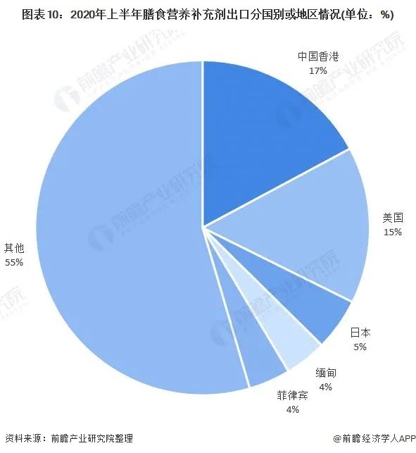 從具體的出口國(guó)別或地區(qū)看,中國(guó)香港、美國(guó)、日本、緬甸和菲律賓是我國(guó)膳食營(yíng)養(yǎng)補(bǔ)充劑主要出口地區(qū),前五大市場(chǎng)集中率為46%。其中,需要關(guān)注的是,中國(guó)香港的出口額總比增長(zhǎng)了57.4%,超越美國(guó),成為膳食營(yíng)養(yǎng)補(bǔ)充劑最大的出口市場(chǎng),由此看來(lái)中國(guó)香港作為膳食營(yíng)養(yǎng)補(bǔ)充劑的中轉(zhuǎn)市場(chǎng),發(fā)揮著重要的作用。