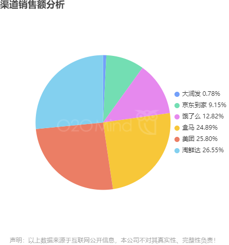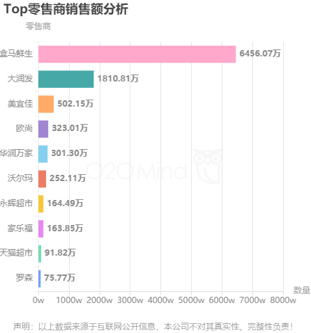 據O2OMind 2021年3月數據顯示,TOP10 零售商中,有5家大賣場,3家超市和兩家便利店;銷量前三的零售商家為盒馬鮮生、大潤發、美宜佳。