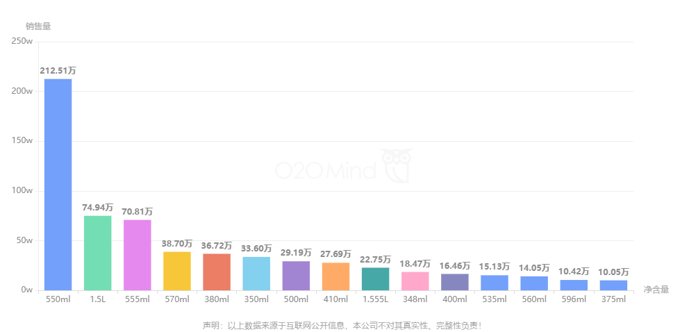 據O2OMind 2021年3月數據顯示,規格為550mL的瓶裝飲用水、5.0L的桶裝飲用水銷量最高,在O2O市場最受歡迎。