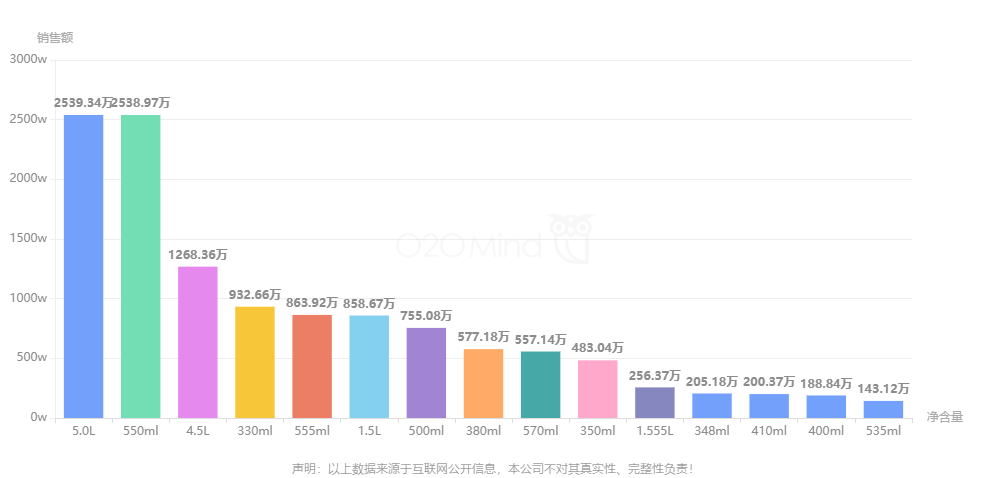而在O2O市場,中大規格包裝飲用水表現同樣不俗。據O2OMind數據顯示,2021年3月包裝飲用水各大O2O平臺銷售額前三為5.0L、550mL、4.0L等中大規格包裝飲用水。