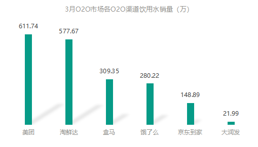據O2OMind 數據顯示,2021年3月O2O市場中,美團包裝飲用水銷量高達611.74萬,居首位;其次是淘鮮達和盒馬,銷量約577.67萬、309.35萬。
