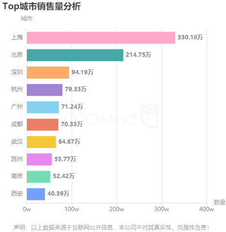 包裝飲用水在O2O售點數較多的一線、新一線城市銷量較高。據O2OMind 2021年3月數據顯示,上海擁有兩萬多個O2O售點,該城市O2O市場包裝飲用水銷量最高,達330.18萬,北京214.75萬次之。