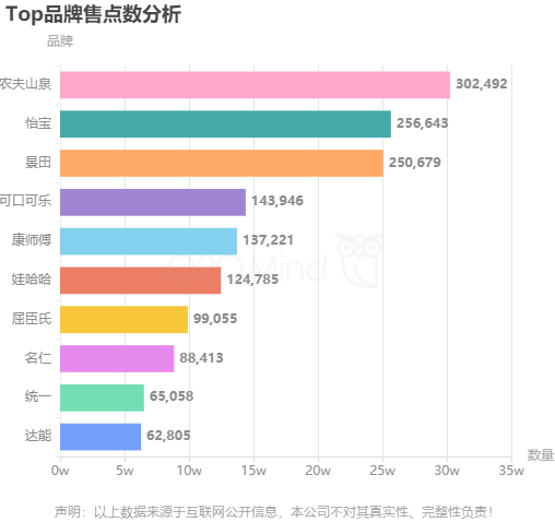 據O2OMind數據顯示,農夫山泉全國包裝飲用水售點最多,達30.24萬,怡寶25.66萬、景田25.06萬售點數緊隨其后。