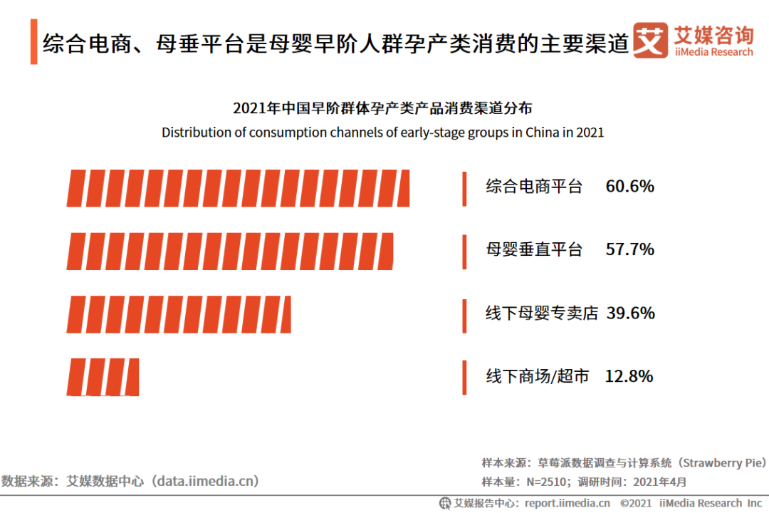 iiMedia Research(艾媒咨詢)數(shù)據(jù)顯示,早階群體孕產(chǎn)產(chǎn)品方面的消費渠道以綜合電商和母垂平臺為主,分別占比為60.6%和57.7%。艾媒咨詢分析師認(rèn)為,母垂平臺對于媽媽群體特別是早階群體來說使用頻率高,且影響力強,依靠平臺的專業(yè)性和內(nèi)容豐富度,母垂平臺能建立起較高的用戶信任度。而隨著母垂平臺的電商屬性加強,其內(nèi)容轉(zhuǎn)化的潛力也不斷增加,有望成為早階群體最主要的孕產(chǎn)類產(chǎn)品購物渠道。