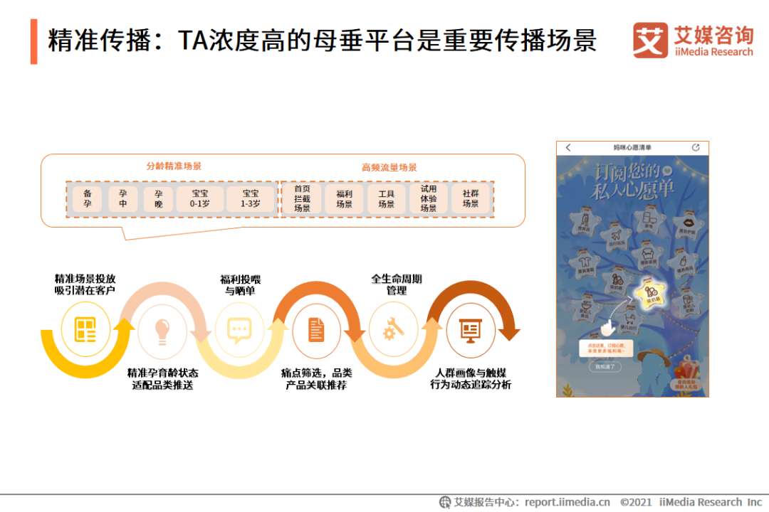 由于母嬰產(chǎn)品的選購時間有限,并且需要分階選品,因此抓住黃金時期的精準(zhǔn)傳播,成為品牌制勝關(guān)鍵。艾媒咨詢分析師認(rèn)為,從當(dāng)前的孕母資訊獲取及“種草”方式看,頭部母垂平臺的使用率明顯更高。以其中獨占率最高的媽媽網(wǎng)為例,可以通過分齡精準(zhǔn)場景和高頻流量場景獲得精準(zhǔn)用戶,并且通過用戶的全生育周期管理。實現(xiàn)分階段的精準(zhǔn)信息傳遞。