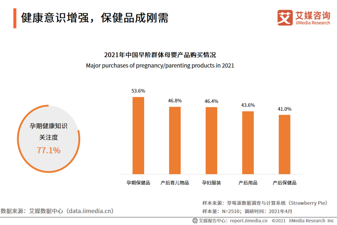 數(shù)據(jù)顯示,中國早階群體對于孕期胎兒養(yǎng)護(hù)和自身護(hù)理的相關(guān)知識關(guān)注度為77.1%,孕期保健品、產(chǎn)后保健品等都是早階群體購買的主要產(chǎn)品。艾媒咨詢分析師認(rèn)為,在大健康理念的盛行下,孕期保健品逐漸成為了早階群體的剛需品,母嬰平臺可以為早階群體提供相應(yīng)的購買指導(dǎo)服務(wù),滿足消費需求的同時也使得科學(xué)懷孕有據(jù)可依。