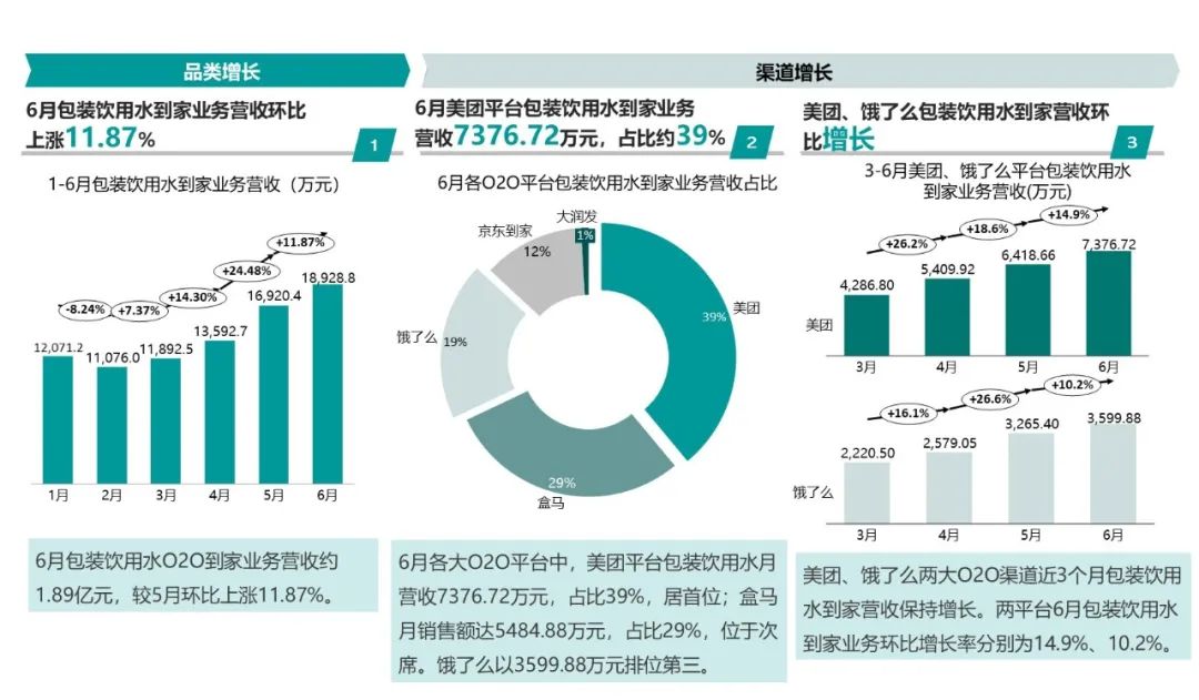美團、餓了么兩大O2O渠道近3個月包裝飲用水到家營收保持增長。兩平臺6月包裝飲用水到家業務環比增長率分別為14.9%、10.2%。
