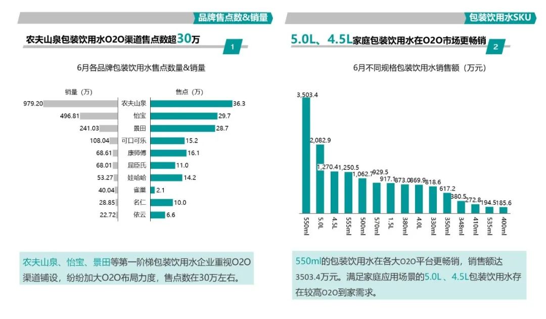 農夫山泉、怡寶、景田等第一階梯包裝飲用水企業重視O2O渠道鋪設,紛紛加大O2O布局力度,售點數在30萬左右。