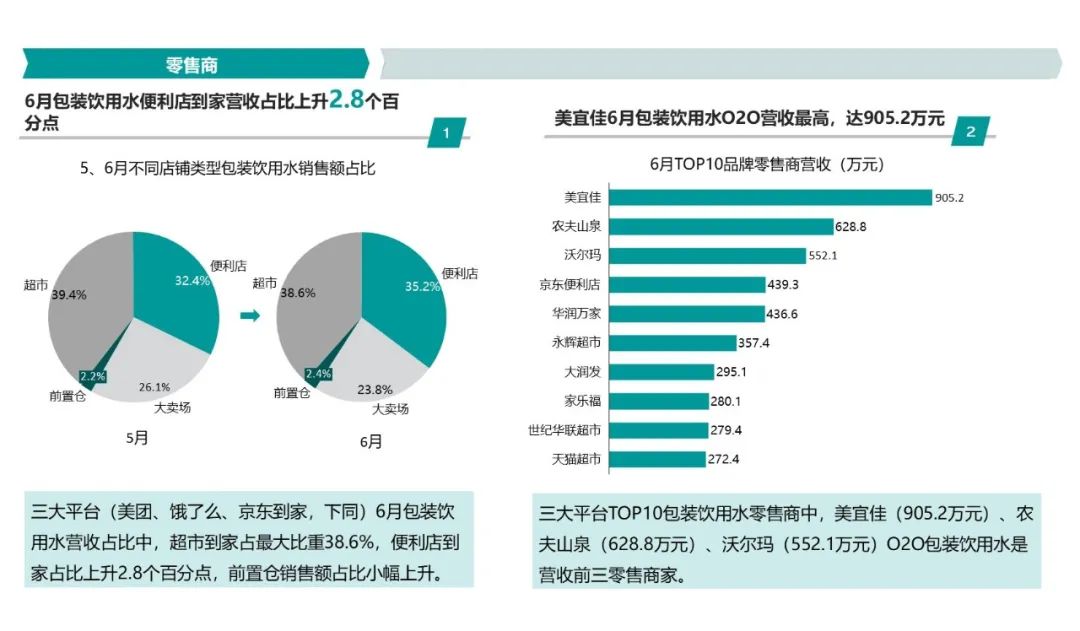三大平臺(美團、餓了么、京東到家,下同) 6月包裝飲用水營收占比中,超市到家占最大比重38.6%,便利店到家占比上升2.8個百分點,前置倉銷售額占比小幅上升。