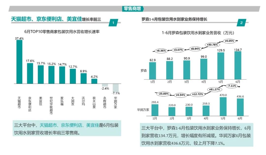 三大平臺中,天貓超市、京東便利店、美宜佳是6月包裝飲用水到家營收增長率前三零售商。羅森1-6月包裝飲用水到家業務保持增長,6月到家營收134.7萬元,增長幅度有所減緩。華潤萬家6月包裝飲用水到家營收436.6萬元,較上月下降7.1%。