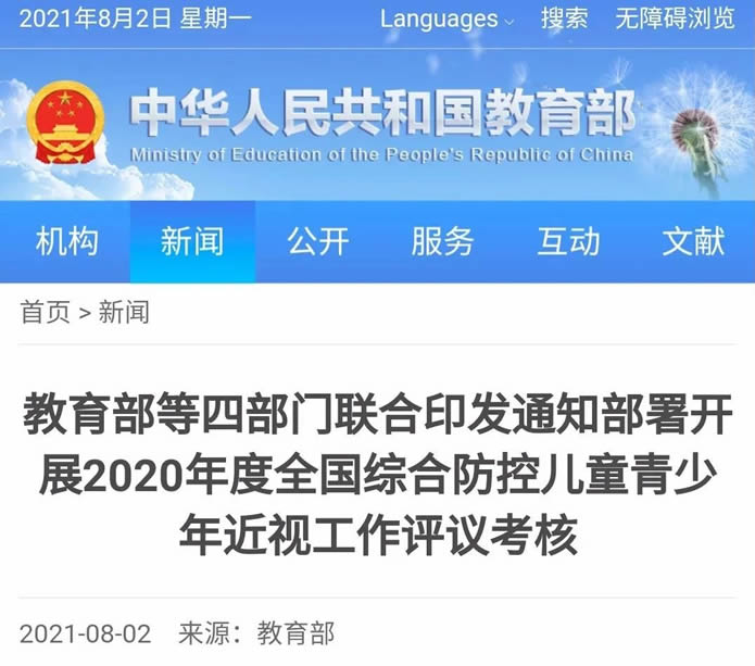 為深入貫徹落實習近平總書記關于兒童青少年近視防控系列重要指示批示精神,落實經國務院同意的《綜合防控兒童青少年近視實施方案》和《全國綜合防控兒童青少年近視工作評議考核辦法(試行)》部署要求。近日,教育部、國家衛生健康委、國家體育總局、市場監管總局聯合印發《關于開展2020年度全國綜合防控兒童青少年近視工作評議考核的通知》,面向各省級人民政府部署開展2020年度全國綜合防控兒童青少年近視工作評議考核。