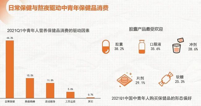 中青年人喜歡為哪方面的營養(yǎng)保健品買單?報告顯示,"日常保健"與"熬夜"是驅(qū)動中青年保健品消費的首二因素,其次是為運動健身、工作出差。服用、攜帶便利是中青年人購買保健品的形態(tài)偏好,因此膠囊產(chǎn)品最受歡迎,其次是口服液、沖劑、片劑、軟糖。