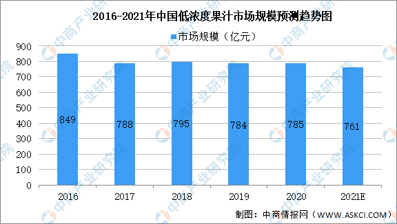 一般認為,含有10%-15%果汁的是低濃度果汁,含有30%、50%、100%的是中高濃度果汁。數(shù)據(jù)顯示,2020年我國低濃度果汁市場規(guī)模達785億元,預計2021年我國低濃度果汁市場規(guī)模可達761億元。