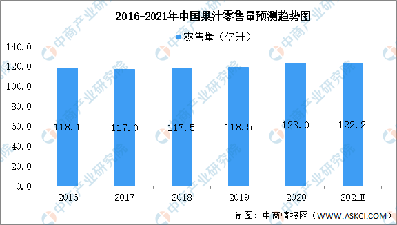 數(shù)據(jù)顯示,我國果汁飲料零售量走勢平穩(wěn)。2019年我國果汁零售量達118.5億升,預計2021年我國果汁零售量可達122.2億升。